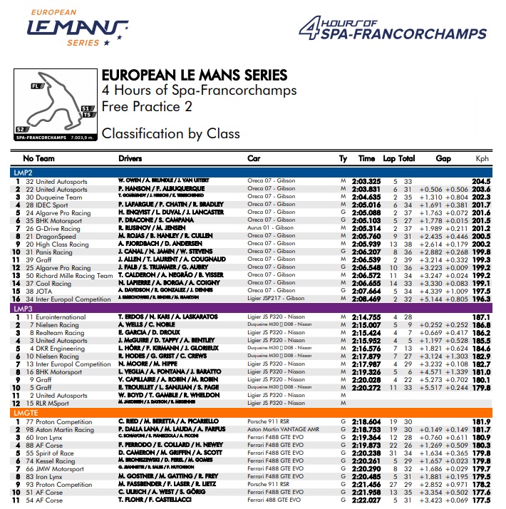 No segundo treino livre para a prova de 4h de Spa-Francorchamps do European Le Mans Series, o #32 da United Autosports, pilotado por W.Owen, A.Brundle e J.Van Uitert, fez o tempo mais rápido (2:03.325s). Na segunda posição ficou o #22 da United Autosports, pilotado por Filipe Albuquerque e Phil Hanson, que ficaram a 0.506s do tempo mais rápido.