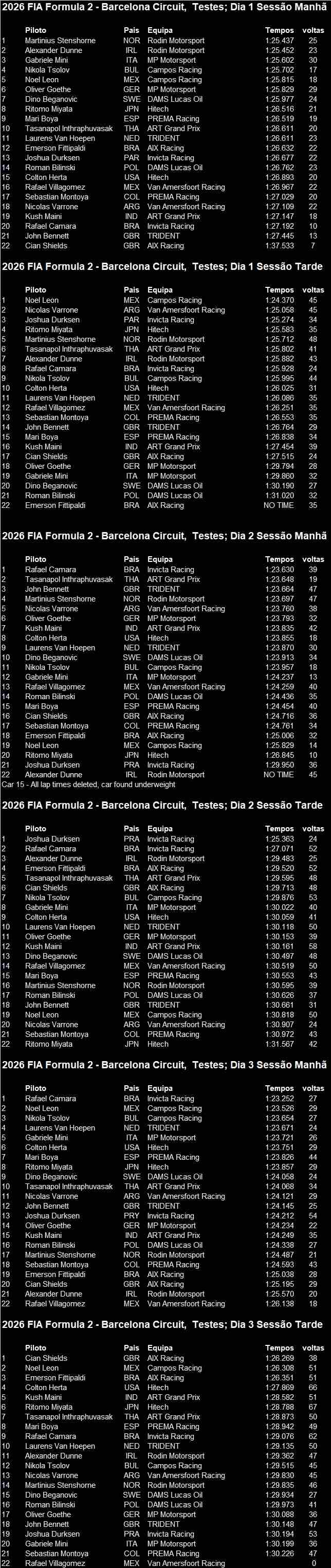 Noel León, da Campos Racing, abriu os testes com o melhor tempo geral do primeiro dia, graças a um 1:24.370 na sessão da tarde, e voltou a colocar-se entre os mais fortes ao terminar o último dia a escassos décimos de Câmara nas folhas de tempos. A Invicta confirmou a sua força coletiva com Joshua Duerksen a liderar a sessão vespertina do segundo dia (1:25.363) e a completar um 1-2 da equipa nessa jornada. No pelotão, nomes como Tasanapol Inthraphuvasak, Alexander Dunne, Laurens van Hoepen, Colton Herta, Gabriele Minì e Ritomo Miyata marcaram presença regular no top 10, enquanto Cian Shields (AIX Racing) fechou o derradeiro turno no topo da tabela, num período já claramente focado em simulações de corrida.