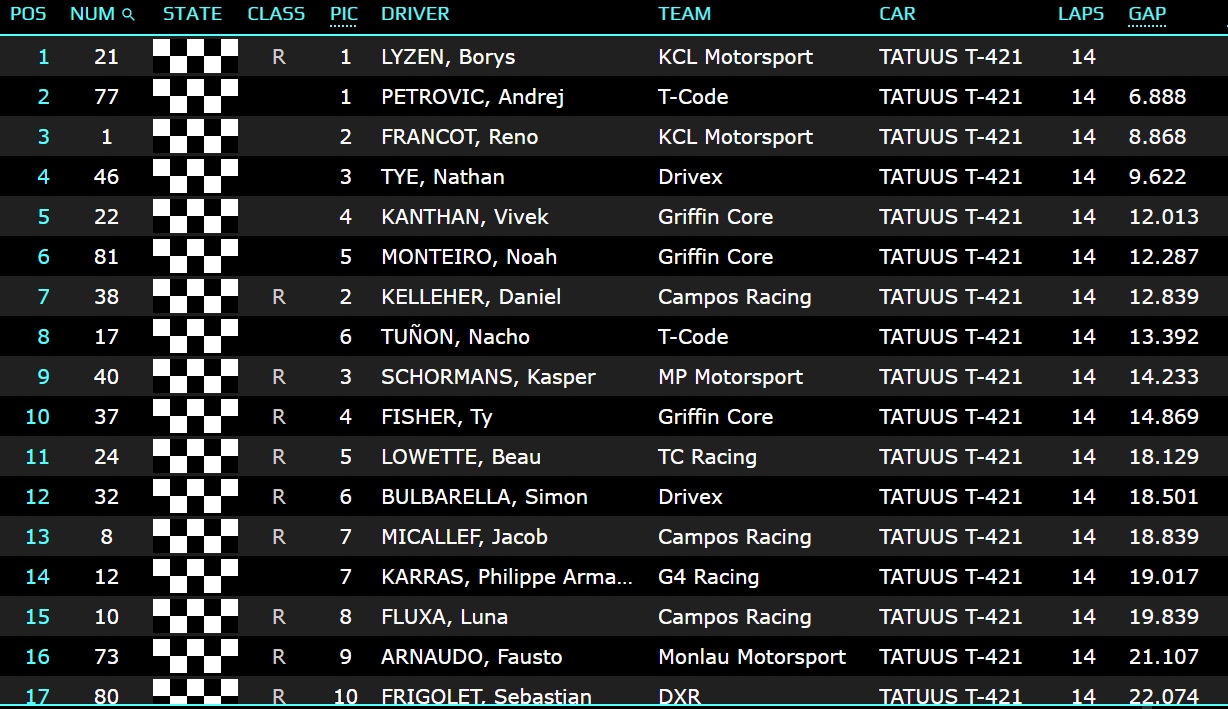 A bandeira de xadrez foi mostrada, antes dos pilotos terem cumprido a volta extra, para lá dos 20 minutos. Ninguém respeitou a bandeira e a corrida continuou, com Lyzen a cruzar a linha de meta com uma vitória dominante e uma distância de mais de seis segundos para Petrovic, com Francot a completar o pódio. Entretanto mais atrás, as lutas deram-nos mais mudanças e Tye terminou em quarto, seguido por Kanthan em quinto e Monteiro em sexto, à frente de Kelleher, Tuñon, Schormans e Ty Fisher. Maria Neto terminou no 20º lugar, enquanto Max Radeck concluiu esta sprint no 26º posto.