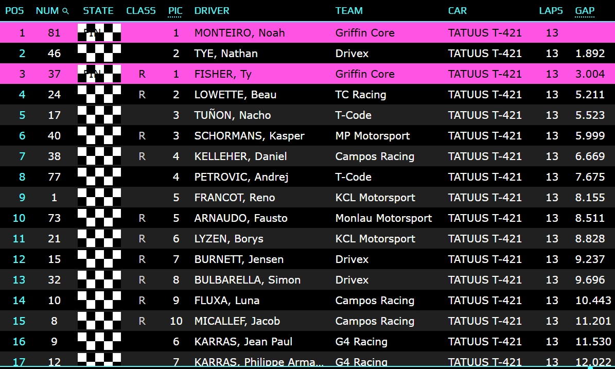 Noah Monteiro largava da pole, acompanhado por Vivek Kanthan (Griffin Core) na primeira linha, com a pressão de Rocco Coronel e Ty Fisher (Griffin Core) na segunda linha.