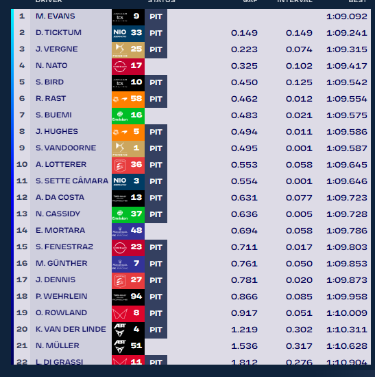 Com menos de 15 minutos para o fim da sessão, a tabela já tinha novos líderes, com Sebastian Buemi (Envision Racing) a assumir o primeiro lugar, destronando Sérgio Sette Câmara (NIO 333 Racing), com Dan Ticktum (NIO 333 Racing) a melhorar o registo do piloto suíço.