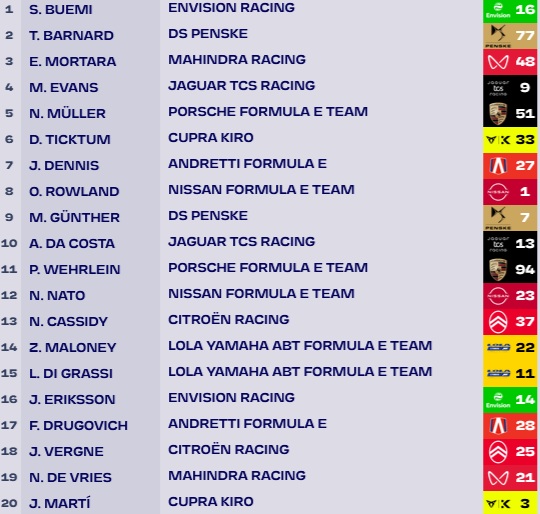 A segunda volta de Ticktum começou mal, com uma tangente à proteção da curva 1, arruinando o seu último esforço. Ninguém melhorou e Buemi ficou com o melhor tempo (1:06.325) seguido de Ticktum, Evans e Rowland, com Max Guenther e Pascal Wehrlein a ficarem de fora das eliminatórias.
