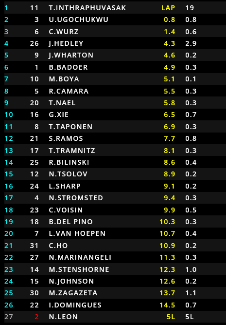 O top 5 ficou completo com Gerrard Xie (Hitech TGR) e Théophile Nael (VAR), enquanto Charlie Wurz, Ugochukwu, Badoer, Giusti e James Wharton fecharam o top 10. James Hedley e Tasanapol Inthraphuvasak completaram os 12 primeiros.