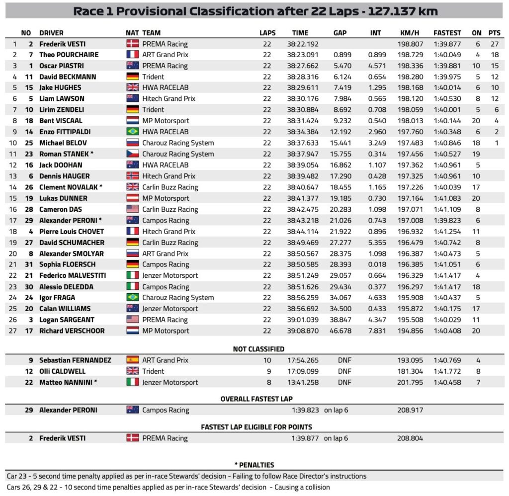 Vesti era agora terceiro, com Pourchaire e Jake Hughes (HWA Racelab) na frente, mas o Safety-Car veio compactar o pelotão. Este entrou em pista devido à saída de Sebastian Fernadez (ART Grand Prix) na chicane Ascari.