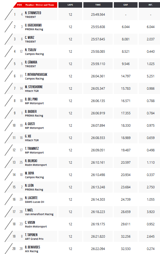 Acabou por vencer com uma impressionante vantagem de seis segundos sobre Ugo Ugochukwu, da Prema Racing, que ficou em segundo lugar. A Trident celebrou um resultado ainda mais notável com Charlie Wurz a completar o pódio em terceiro, garantindo um 1-3 para a equipa.