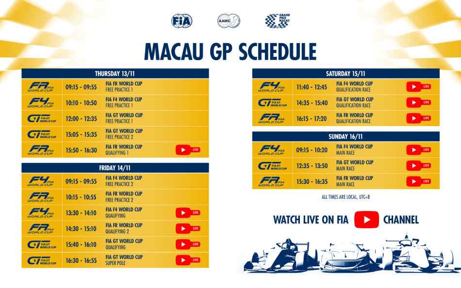 O 72º Grande Prémio de Macau decorre de 13 a 16 de novembro e será palco de quatro importantes provas mundiais da FIA: a segunda edição da FIA Formula Regional World Cup, a oitava FIA GT World Cup, a ronda de encerramento do Kumho FIA TCR World Tour e a estreia absoluta da FIA Formula 4 World Cup.