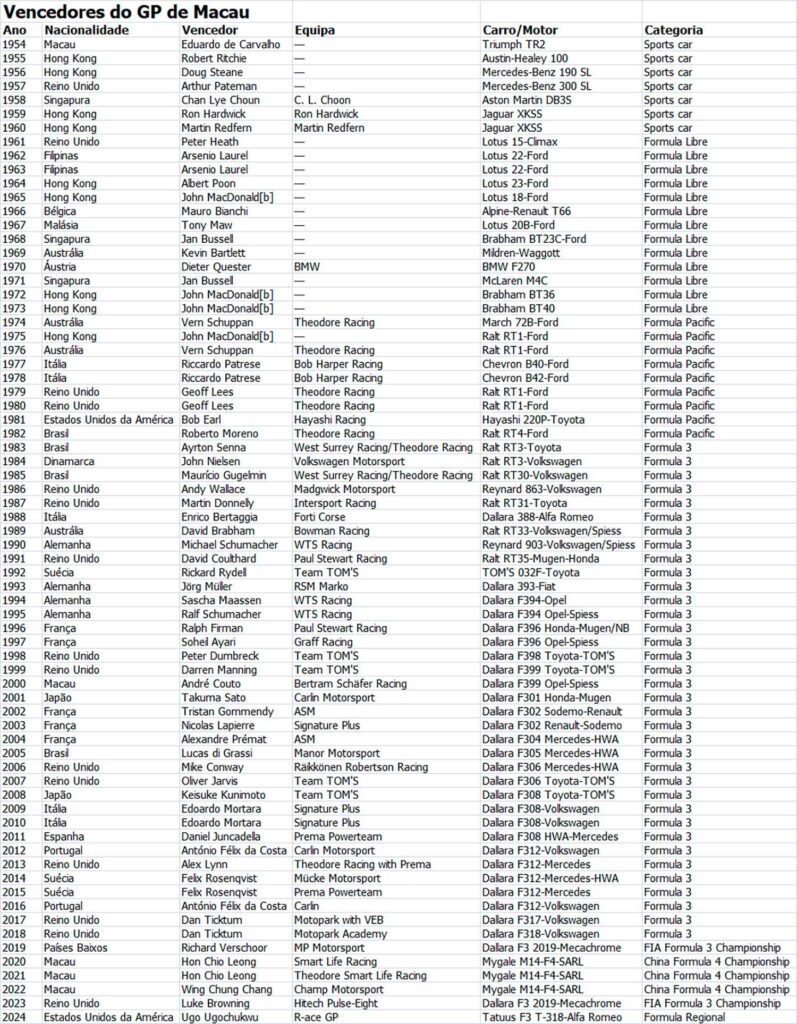 O Grande Prémio de Macau volta a afirmar-se como referência global, reunindo pilotos, marcas e adeptos numa semana de grande paixão pelo desporto automóvel. Já não tem o mesmo charme do passado, basta olhar para o palmarés em baixo, mas continua a ser um fantástico evento.