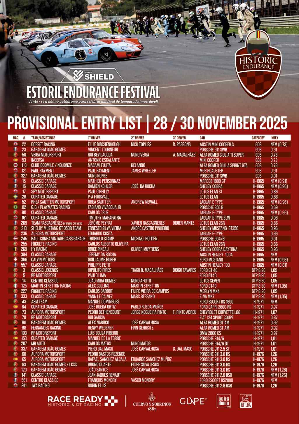 Entre os favoritos está Pedro Bastos Rezende, que tentará repetir o triunfo dos últimos dois anos com o seu Porsche 911 3.0 RS, procurando ser o primeiro a alcançar três vitórias neste desafio. Outros vencedores históricos presentes incluem a dupla João Mira Gomes / Nuno Afoito com o Lotus Seven de 2014 e Carlos Barbot ao volante do seu Merlyn MK4 de 2019 e 2020. Equipas que ainda não venceram a prova mas ganharam em 2025, como Bruno Duarte / Filipe Jesus (Porsche 911 3.0 R) e Paulo Lima (Ford GT40), também prometem animar a corrida, assim como o duo Brice Pineau / Olivier Muytjens, que substituem o Ford GT40 pelo Shelby Cobra Daytona.