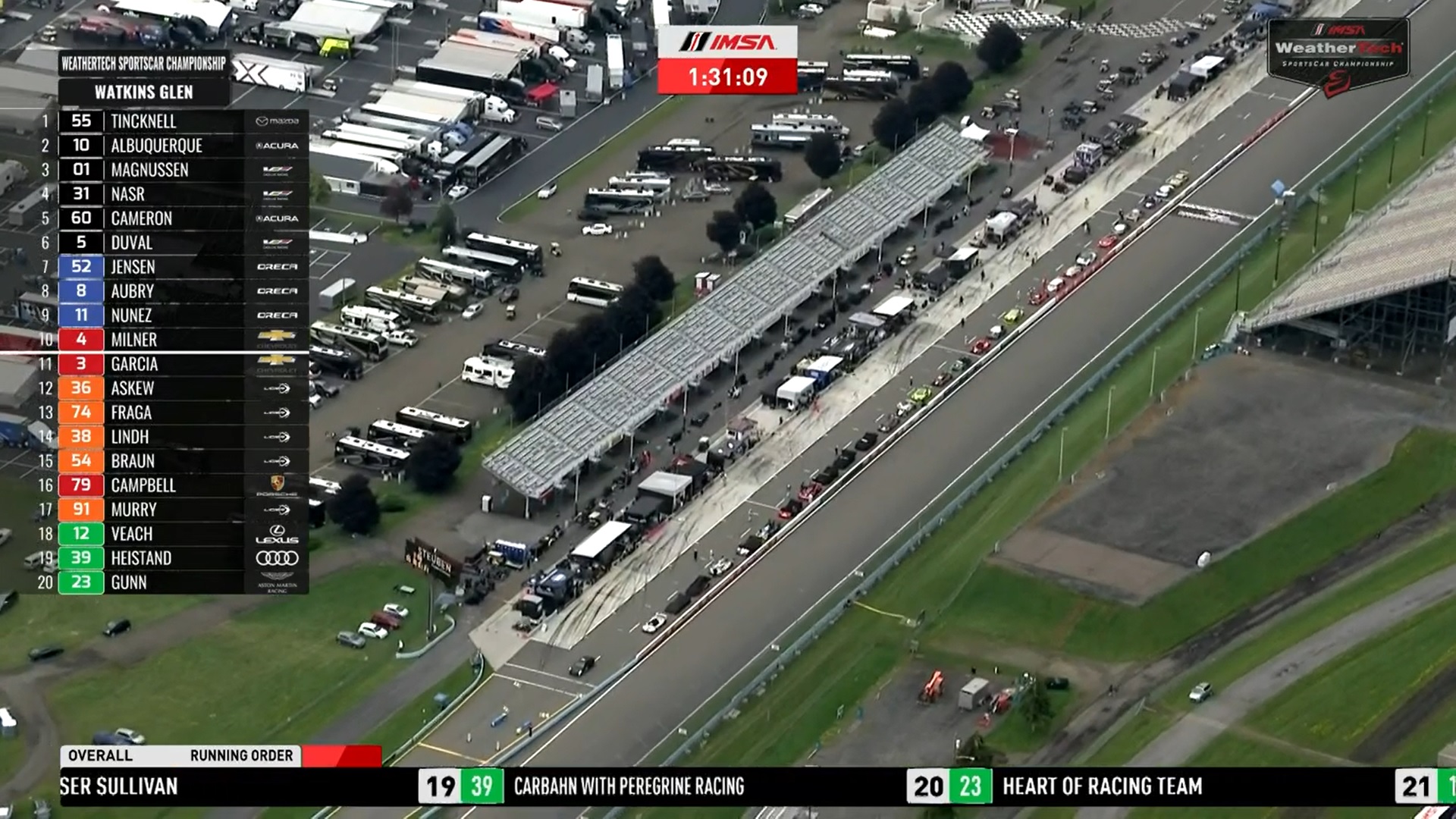 A corrida de 2h40 em Watkins Glen foi interrompida com bandeiras vermelhas, devido às péssimas condições climatéricas que se fazem sentir ao largo do circuito e já em algumas zonas do mesmo. O nível 3 de alerta, o mais gravoso no IMSA, foi declarado, com as equipas a serem encorajadas a sair do pitwall, inclusive. Tratam-se de fortes trovoadas que podem colocar em perigo todos os intervenientes e espetadores presentes.