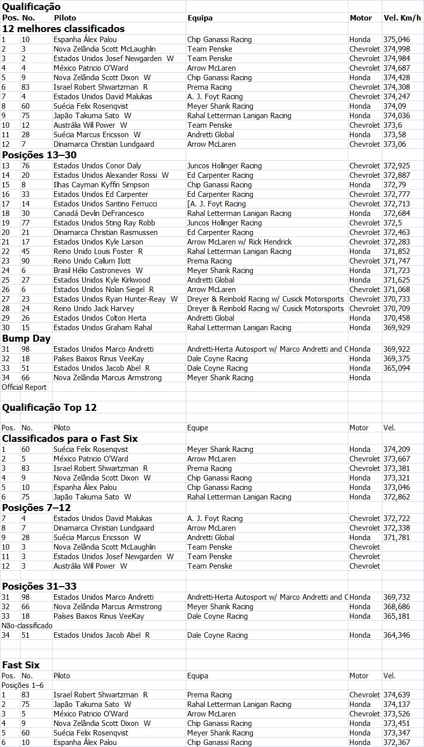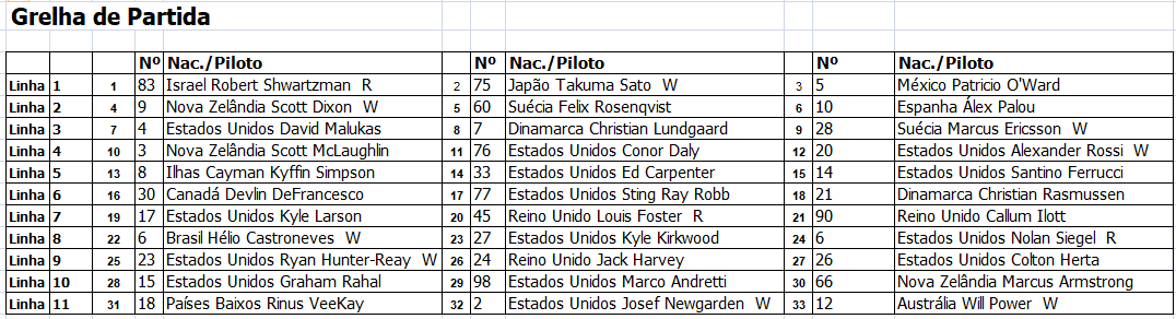 Em resumo, a largada da 109ª edição das 500 Milhas de Indianapolis terá Robert Shwartzman na frente, a partir da pole na sua primeira corrida em ovais, e logo nas Indy 500. Ironia do destino, Josef Newgarden, vencedor das duas últimas edições, partirá da última fila devido a uma penalização à Team Penske por irregularidades técnicas.