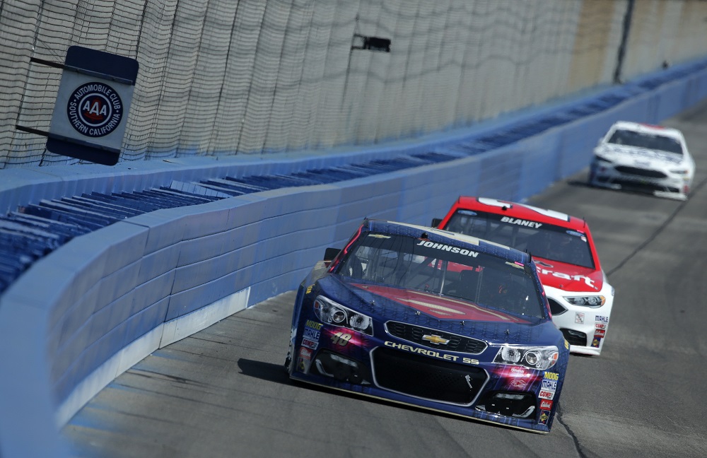 Jimmie Johnson é o primeiro piloto a ganhar duas corridas este ano na NASCAR Sprint Cup. O piloto da Hendrick Motorsports venceu a Auto Club 400, na oval de Fontana, no prolongamento, aproveitando melhor os pneus novos nas últimas duas voltas, ultrapassando Kevin Harvick, que liderou a maior parte da corrida e tinha a vitória garantida antes da última situação de bandeiras amarelas, causada quando um pneu do Toyota de Kyle Busch rebentou. A segunda vitória de Johnson (que nesta corrida publicitou o filme Superman v. Batman no carro) coloca-o em vantagem pontual quando começar a primeira fase da Chase for the Cup.