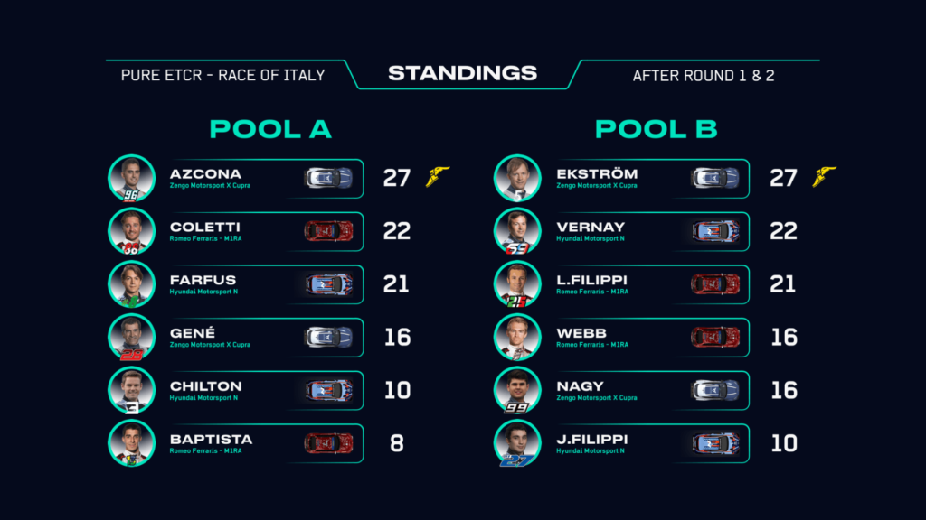 A dupla vitória de Ekström significa que lidera o Pool B com 27 pontos, com Jean-Karl Vernay da Hyundai Motorsport N cinco pontos atrás em segundo e Filippi com 21 pontos em terceiro. Vernay tinha sido derrotado na curva 1 por Ekström no início da Batalha do Round 1 e terminou em segundo. O francês foi incapaz de desafiar o seu rival, que usou muito dos seus 40 segundos de Power-Up mais cedo, levando o seu carro de 300kW para 500kW e construindo uma grande vantagem. Isso levou a uma luta de um contra um entre Vernay e o companheiro de equipa de Ekström, Dániel Nagy no Round 2.