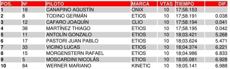 Os principais protagonistas foram Canapino, Thiago Martínez (Toyota Etios), Joaquín Cafaro (Renault Clio), Germán Todino (Etios) e Nicolás Moscardini (Etios).
