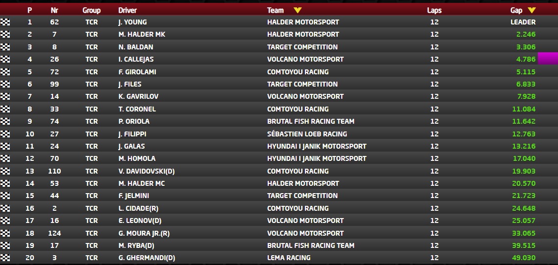 Até ao final da corrida a ordem dos dez primeiros não se alterou e Tom Coronel (Comtoyou Racing/Audi RS 3 LMS II TCR) terminou em oitavo, atrás de Files e Gavrilov. Pepe Oriola (Brutal Fish Racing Team/Honda Civic Type R FK7 TCR) foi nono e John Filippi (Sébastien Loeb Racing/CUPRA Leon Competición TCR) fechou o top 10.