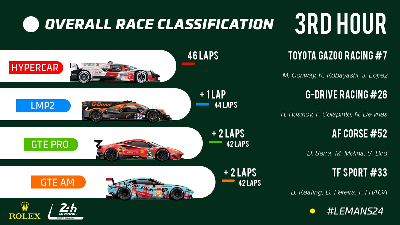 Nos Hypercar, a liderança passou para o Toyota #7, depois do carro #8 ter parado. O Alpine A480 – Gibson #36 continua no 3º posto. O Toyota GR010 – Hybrid #8, com Sébastien Buemi ao volante, envolveu-se num toque com o Oreca #39 da SO24-Dirob By Graff na curva 1, com alguma violência nos primeiros instantes da última hora. O carro #39 recebeu uma repreensão por causa do incidente.