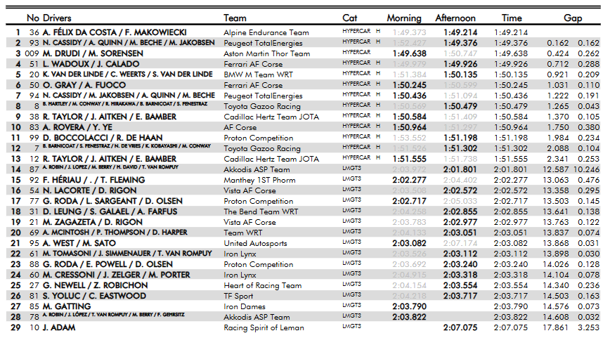 Nick Cassidy classificou-se em segundo lugar entre os Novatos, a apenas 0,162 segundos de Félix da Costa, ao volante do Peugeot 9X8. Lilou Wadoux, primeira vencedora feminina em corridas do campeonato, fez o terceiro melhor tempo com o Ferrari AF Corse 499P, seguida pelo múltiplo campeão do GT World Challenge Europe Sprint Cup, Charles Weerts, ao volante do BMW M Team WRT M Hybrid V8.