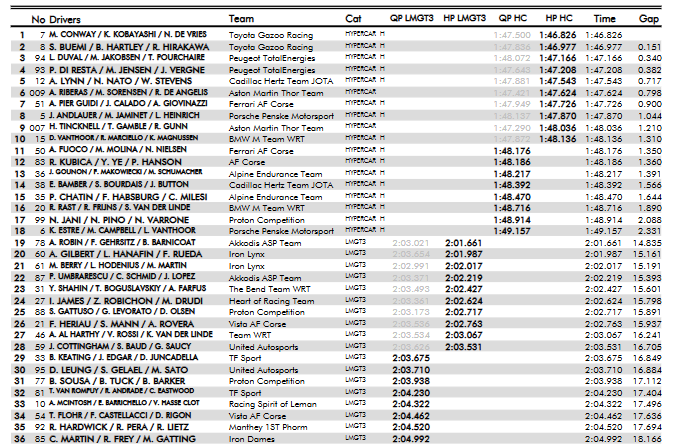 O piloto japonês da Toyota Gazoo Racing estabeleceu o tempo de referência ao volante do #7 Toyota GR010 Hybrid Hypercar, com 1m46,826s, superando o seu colega Brendon Hartley no Toyota #8.