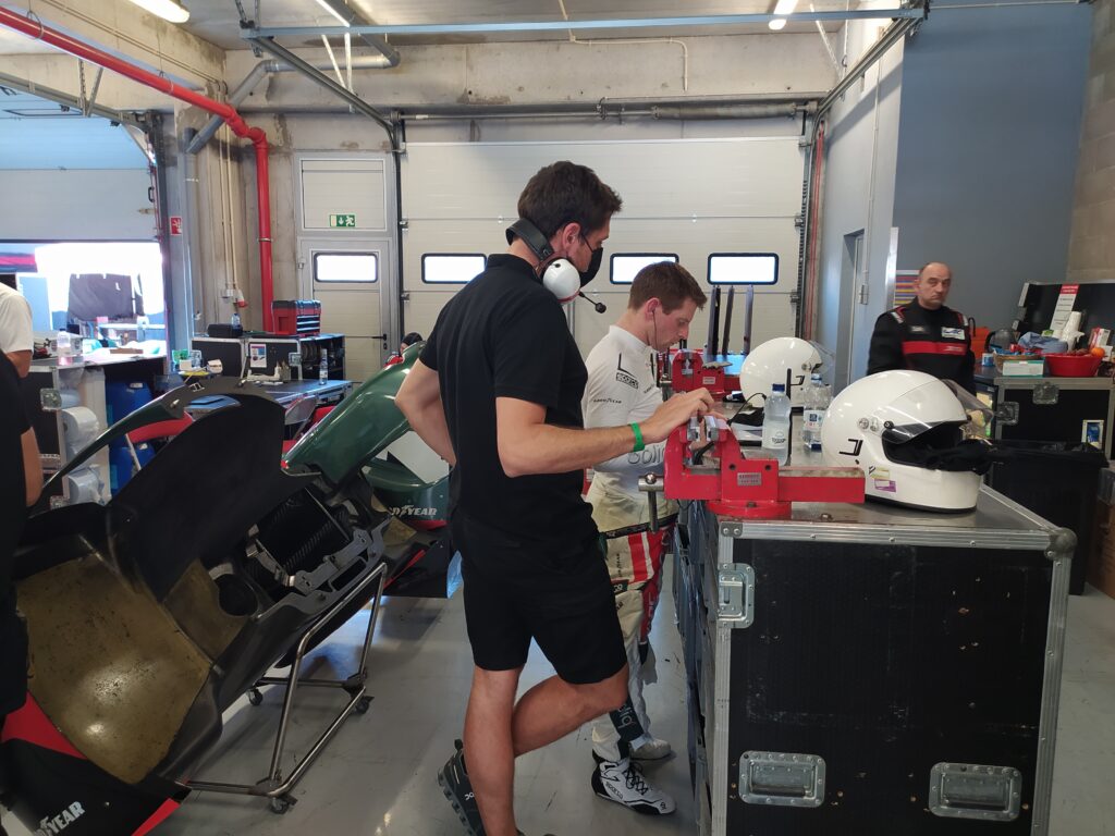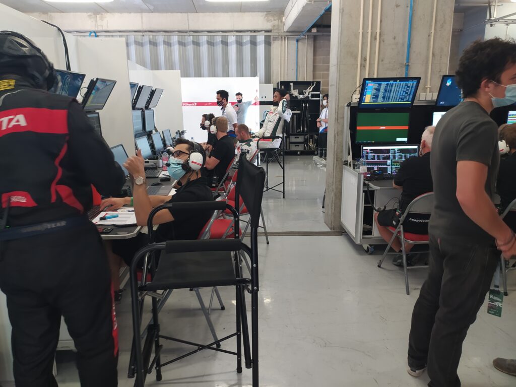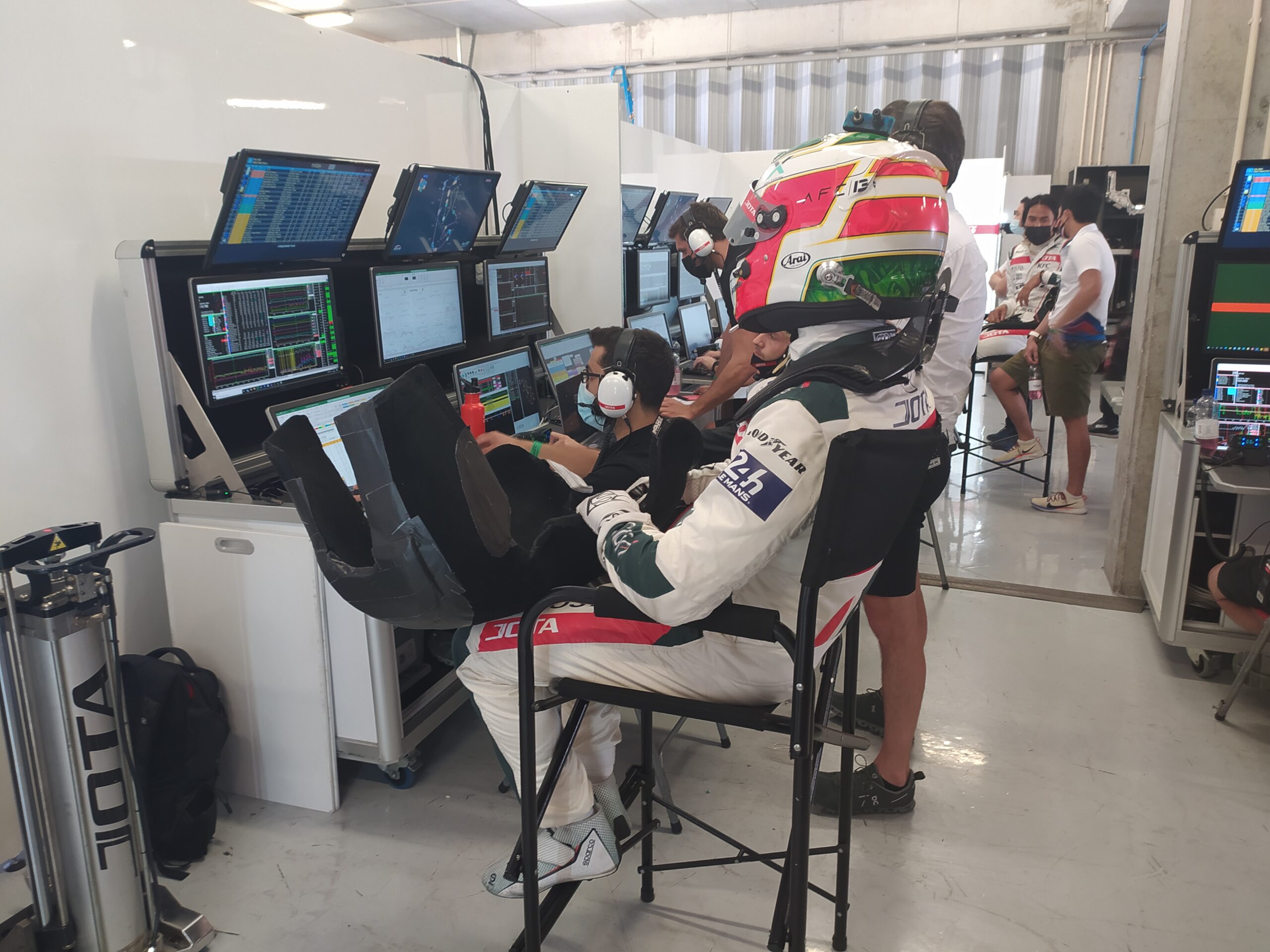 Ao entrar na box da JOTA, somos confrontados com uma parede de ecrãs, onde números e gráficos se sucedem numa cadência quase hipnotizante, com os mecânicos em constante agitação, preparando o que é necessário para os próximos passos da equipa, e os engenheiros mergulhados nos ecrãs à sua frente. A entrada da box chega a ser algo intimidatória, pois parece que entramos num mundo onde o foco de todos, sem exceção, está nos tempos por volta que vão surgindo quase metronomicamente. Além dos engenheiros e dos mecânicos, passamos por caras conhecidas como Stoffel Vandoorne, Tom Blomqvist e Anthony Davidson (entre outros) que também não largam os ecrãs por um segundo, analisando ao detalhe todas as mudanças que ocorrem.