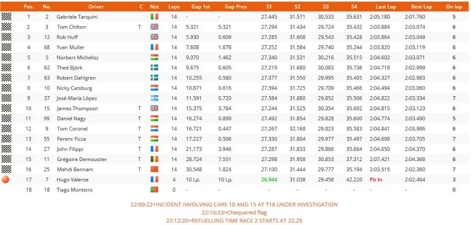 Antes de se colar a Chilton, Huff teve de se livrar de Robert Dahlgreen, que também esteve para ficar de fora da prova depois de um toque de Yvan Muller. Já Mehdi Bennani recebeu um drive through pela colisão em Nicky Catsburg durante a primeira partida.